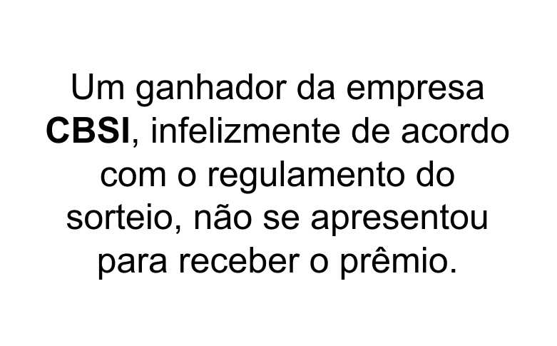 O segundo ganhador da empresa CBSI, infelizmente de acordo com o regulamento do sorteio, não se apresentou para receber o prêmio.